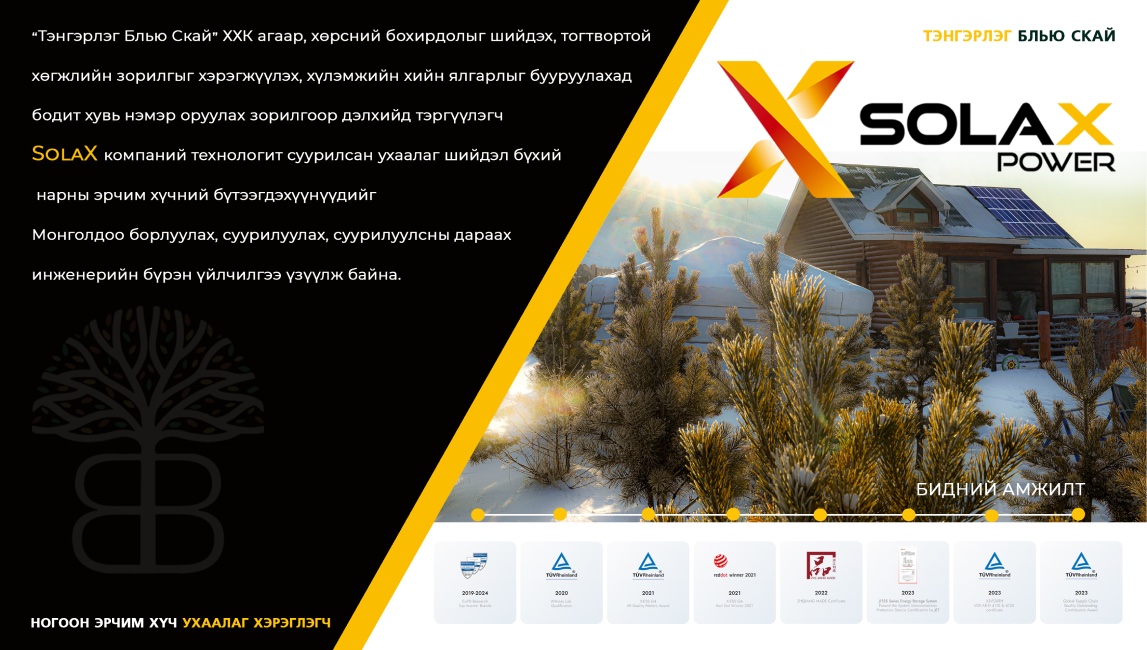 “Тэнгэрлэг Блью Скай” ХХК агаар, хөрсний бохирдолыг шийдэх, тогтвортой хөгжлийн зорилгыг хэрэгжүүлэх, хүлэмжийн хийн ялгарлыг бууруулахад бодит хувь нэмэр оруулах зорилгоор дэлхийд тэргүүлэгч SolaX компаний технологит суурилсан ухаалаг шийдэл бүхий нарны эрчим хүчний бүтээгдэхүүнүүдийг Монголдоо борлуулах, суурилуулах, суурилуулсны дараах