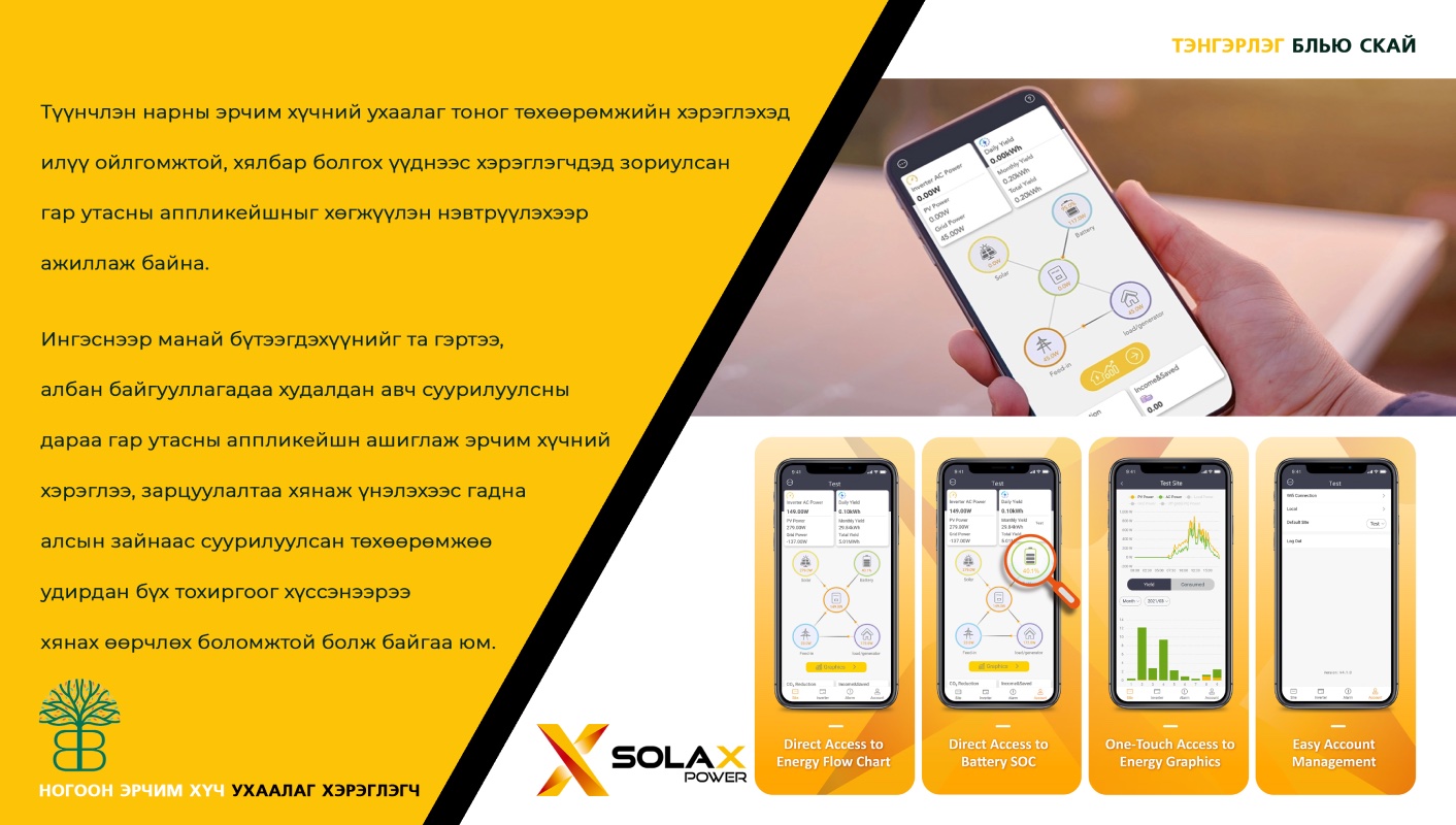 Түүнчлэн нарны эрчим хүчний ухаалаг тоног төхөөрөмжийн хэрэглэхэд илүү ойлгомжтой, хялбар болгох үүднээс хэрэглэгчдэд зориулсан гар утасны аппликейшныг хөгжүүлэн нэвтрүүлэхээр